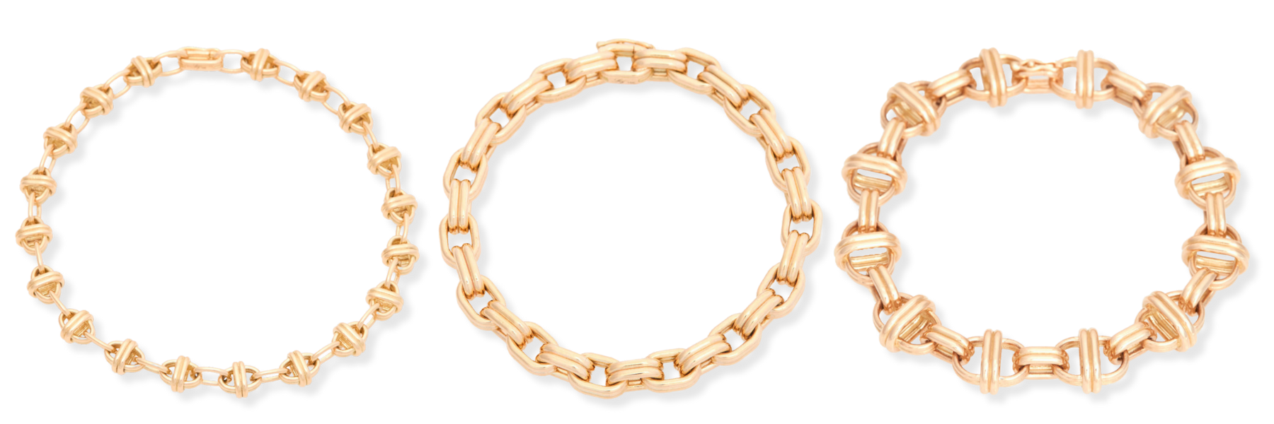 Bracelets pictured left to right: Oval Chain (small link), Double Box Chain (medium link) and Oval Chain (large link).