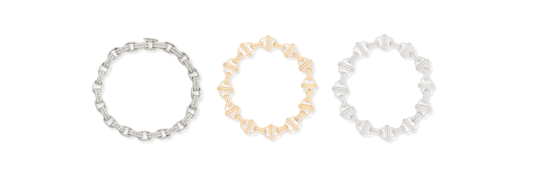Bracelets pictured left to right: Pavé Diamond Double Box Chain, 18k White Gold (medium link) | Pavé Diamond Oval Chain, 18k Yellow Gold (large link) | Pavé Diamond Oval Chain, 18k White Gold (large link)