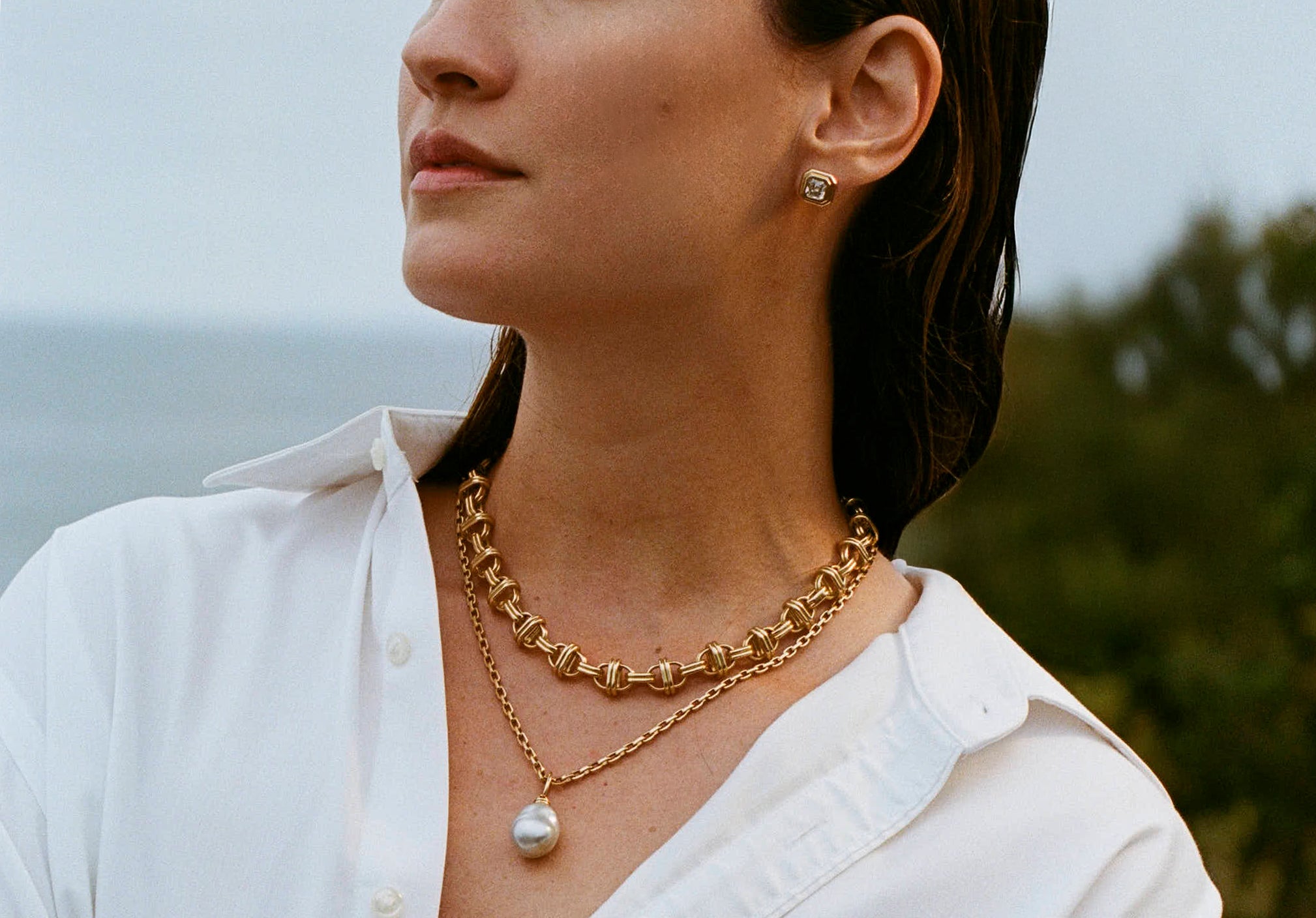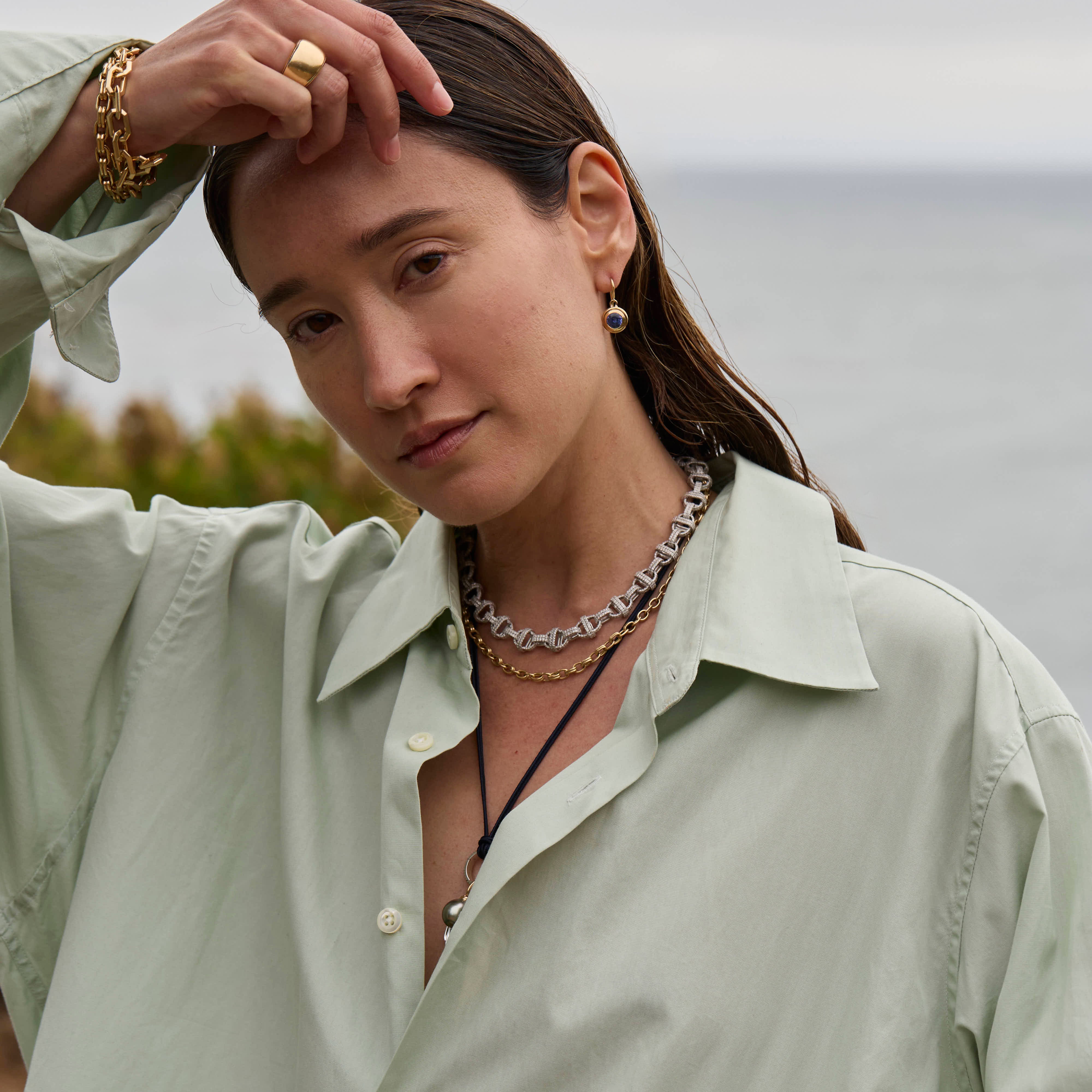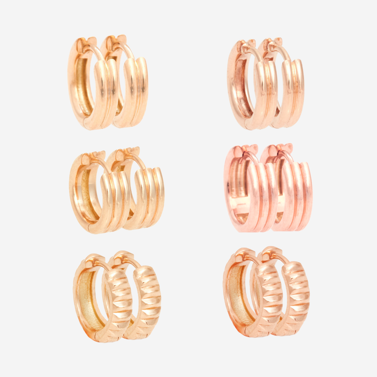 We offer three distinct designs for our huggie style earrings, barre, double, and triple. Each style features a continuous, seamless closure and is crafted by hand in Los Angeles using our proprietary warm 18k gold alloy. The barre features our signature textured design, while the double and triple Huggies offer sleek versions based off of our double and triple link necklaces.