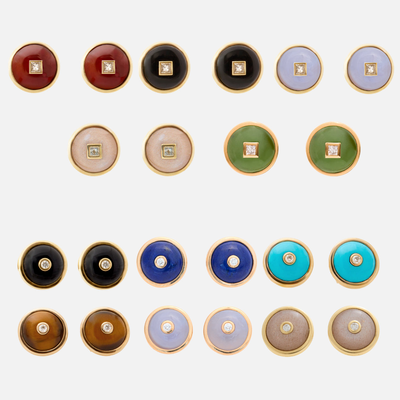 Our Diamond Stone Studs come in our custom stones - Onyx, Nephrite Jade, Peach Moonstone, Lapsi, Tiger's Eye and a range of Chalcedony. Pick your stone and your size - medium with Princess-cut Diamond or small with Round Brilliant that works best for you.