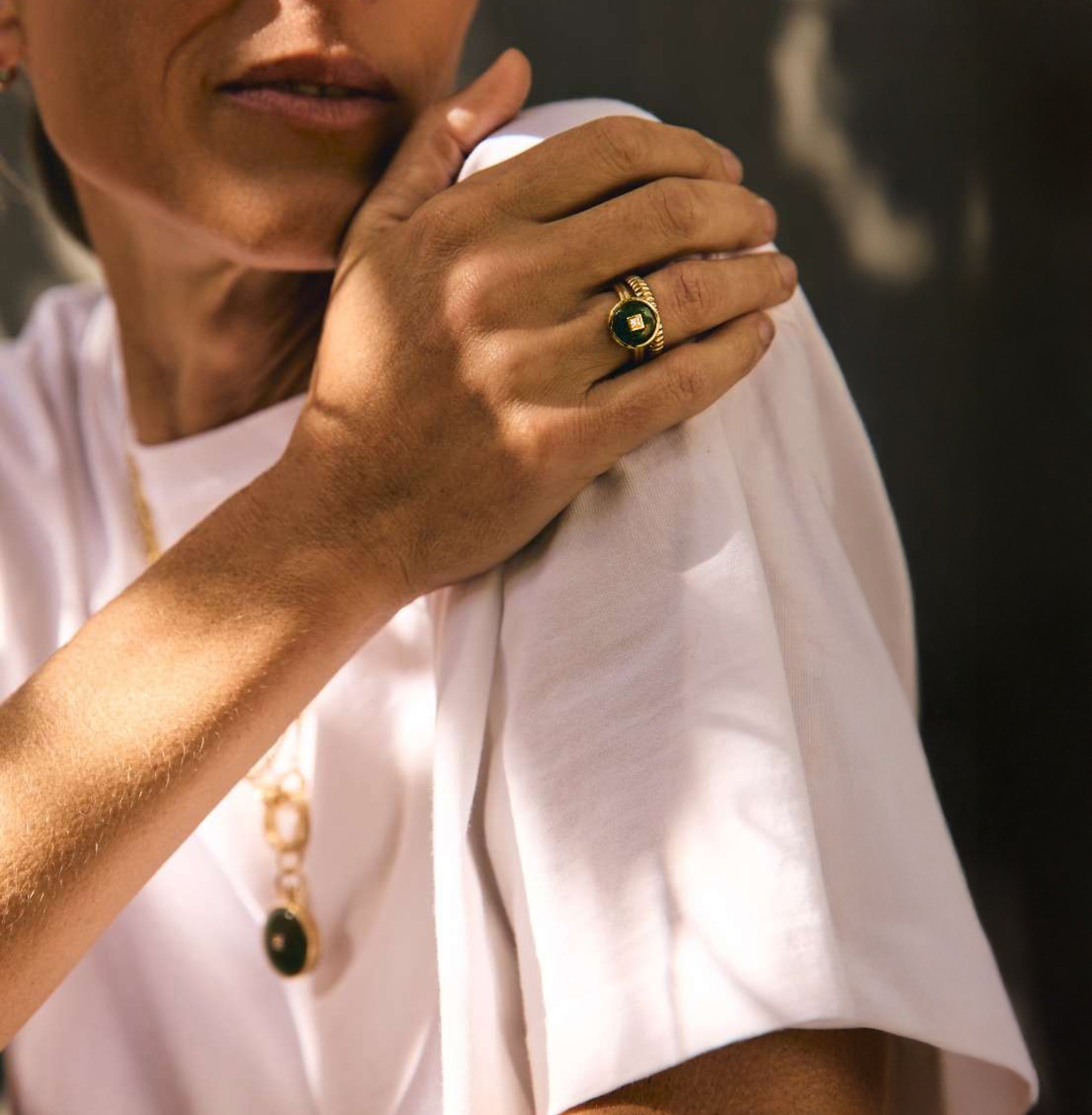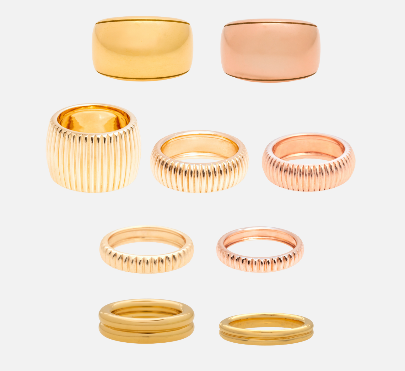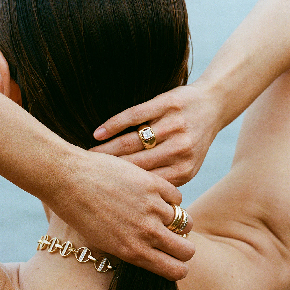 Inspired by vintage cufflinks from the Art Deco period, this collection features bold, sculptural rings that can be worn on their own or stacked.