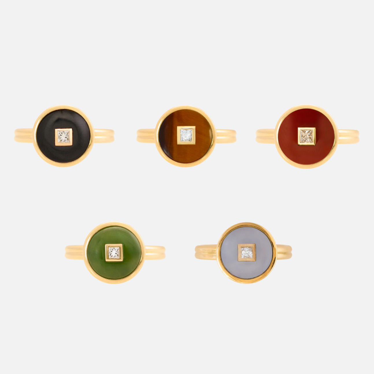 Offered in an assortment of stones including Nephrite Jade, Tiger's Eye, Onyx and a range of Chalcedony, each ring is crafted to highlight the unique beauty and character of the material. Choose from styles we have in stock, or select your preferred stone and we will customize a ring just for you.